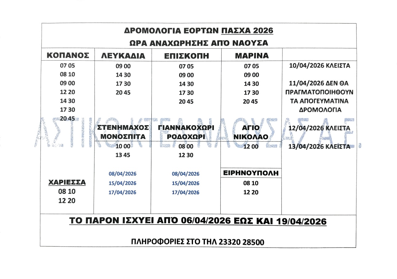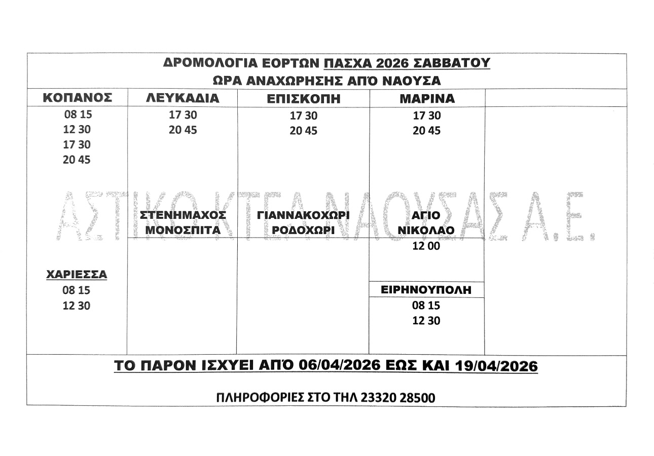 19 Ιουλίου, 2019 admin Δρομολόγια ΩΡΕΣ ΑΝΑΧΩΡΗΣΗΣ ΑΠΟ ΝΑΟΥΣΑ ΔΕΥΤΕΡΑ-ΠΑΡΑΣΚΕΥΗ ΣΑΒΒΑΤΟ ΠΛΗΡΟΦΟΡΙΕΣ ΣΤΟ ΤΗΛ. 2332028500 .
